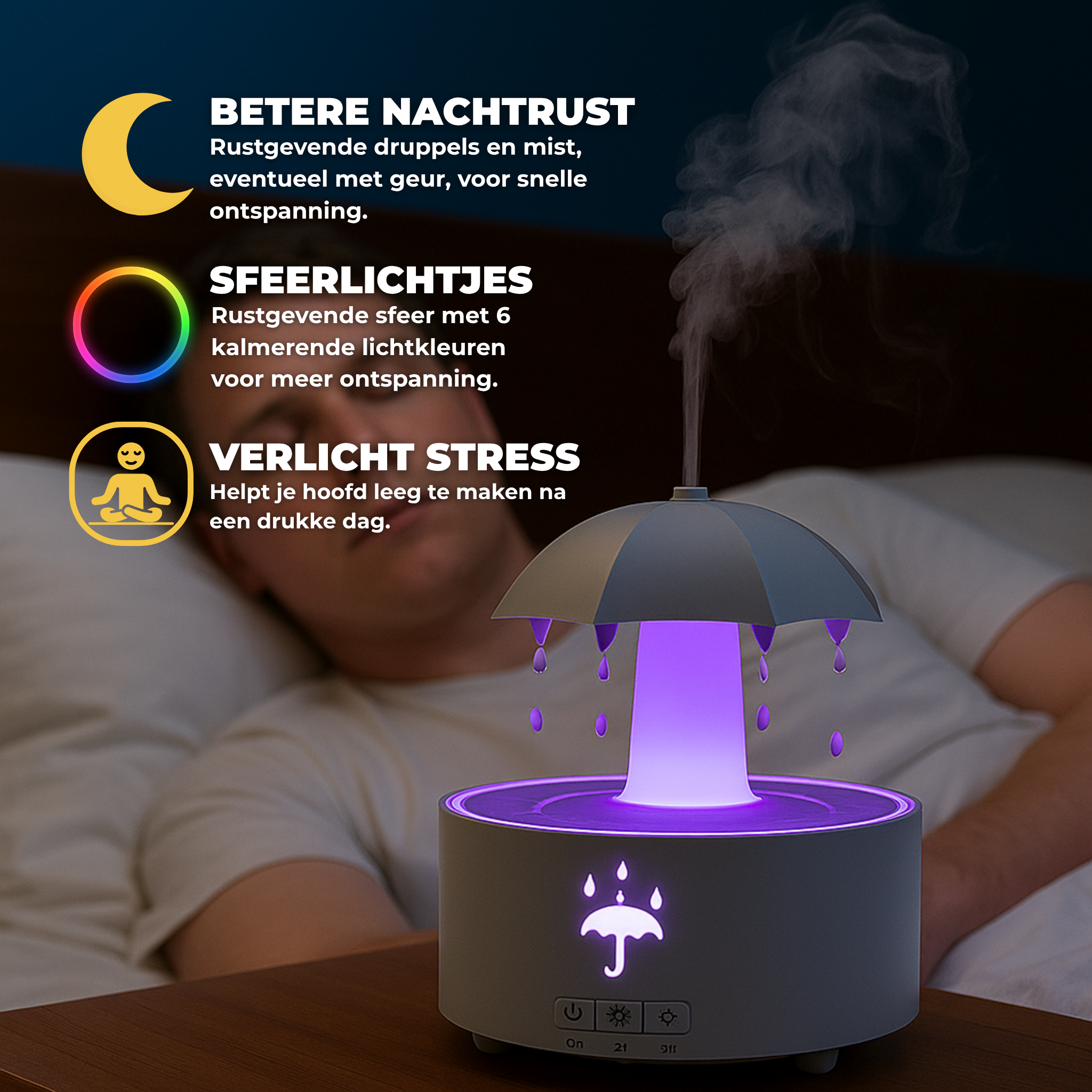 The combination of soft mist, fragrant oils and subtle raindrop sounds helps you fall asleep faster and rest more deeply.